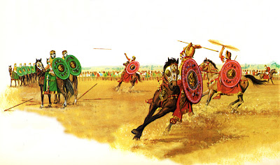Nel III° sec. AD compaiono elmi con maschere a forma di donna dalle caratteristiche capigliature, forse a rappresentare le mitiche Amazzoni da contrapporre ai cavalieri dell' altra squadra.